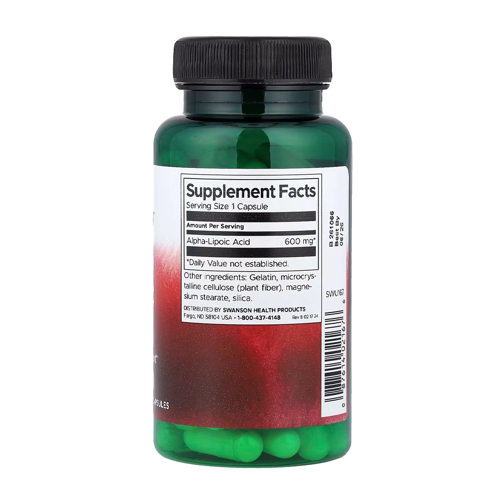 Swanson Alpha Lipoic Acid 600 mg — это высокодозированная версия альфа-липоевой кислоты от Swanson, обеспечивающая 600 мг ALA в одной капсуле – вдвое больше, чем в стандартной версии 300 мг. Такой формат рассчитан на тех, кто нуждается в интенсивной антиоксидантной поддержке или более высоких дозировках по рекомендации специалиста, и позволяет получить полную суточную дозу в одном приеме без необходимости принимать несколько капсул.