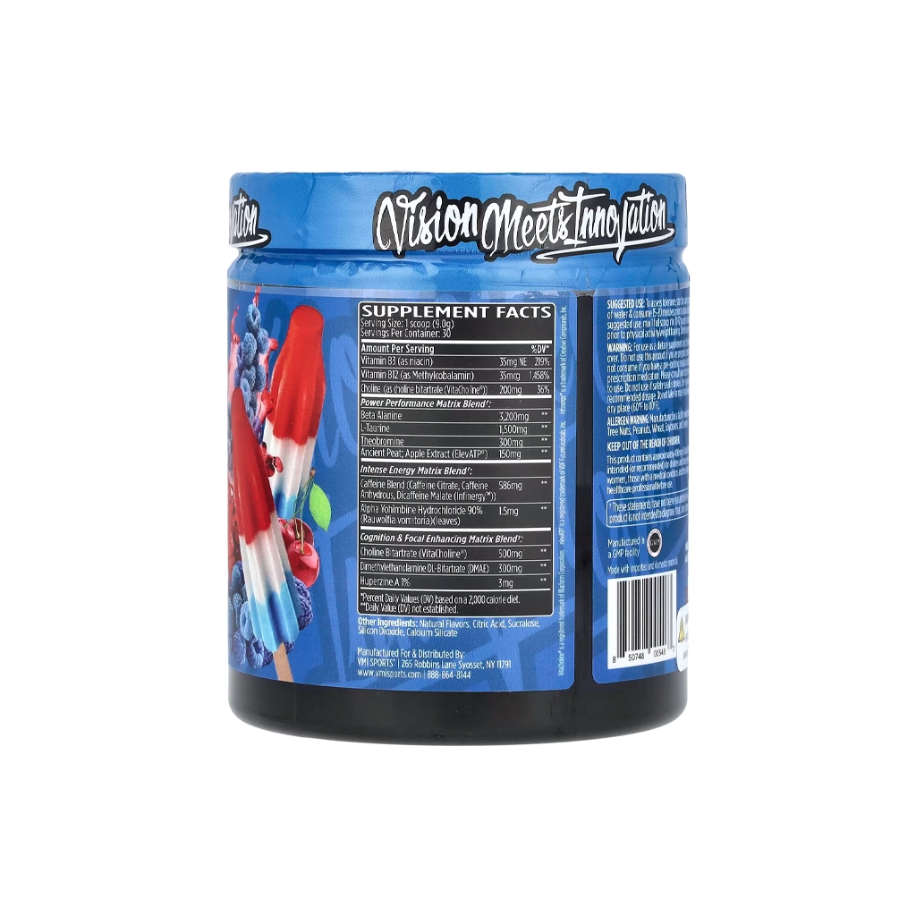 VMI Sports KXR Patriot Pop - мощный предтренировочный комплекс из 400 мг кофеина, комплекс для пампа, фокуса и выносливости. Содержит цитруллин малат, бета-аланин, ElevATP®, гуперзин А и холин. Заряд энергии, концентрации и пампа без компромиссов.