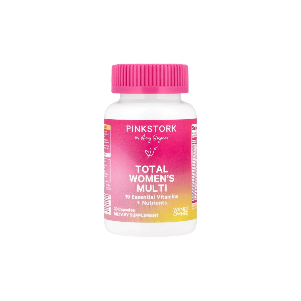 Pink Stork Total Women's Multi – это премиальный мультивитаминный комплекс, специально созданный для женщин основательницей бренда Amy Suzanne. Продукт содержит 19 ключевых витаминов и минералов в лучших биодоступных формах: Ferrochel® (железо бисглицинат), Albion® zinc bisglycinate, VegD3® (растительный D3) и активный фолат L-5-MTHF.