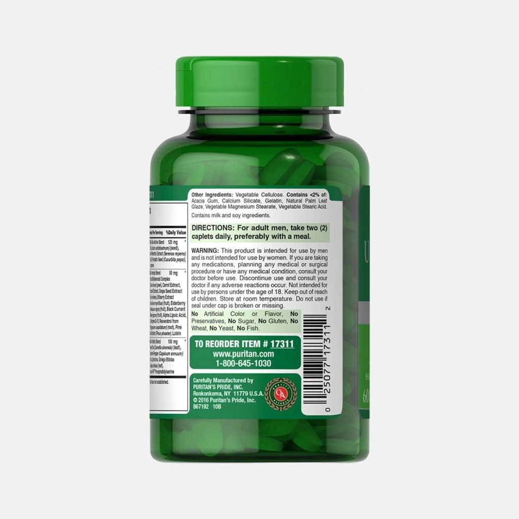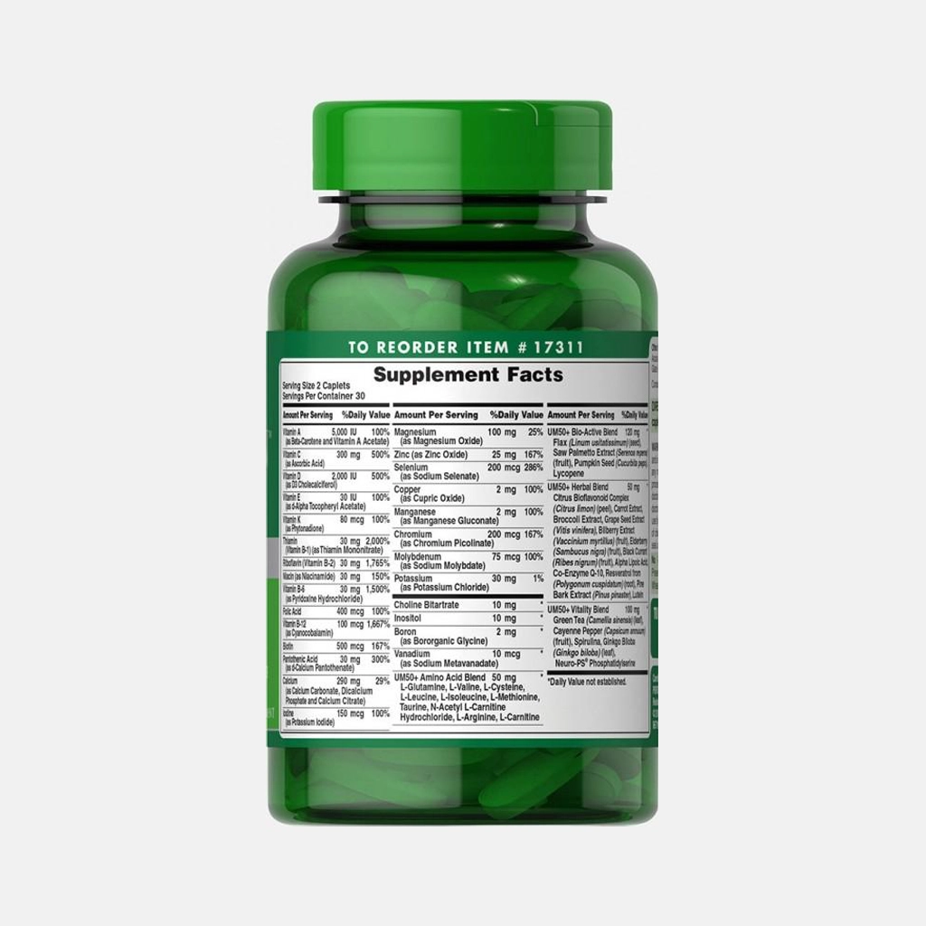 Puritan's Pride Ultra Man™ 50 Plus – это комплекс мультивитаминов и минералов, созданный с учетом специфических потребностей мужского организма после 50 лет. В этом возрасте организм нуждается в питательных веществах, поддерживающих иммунную систему, сердечно-сосудистую систему, нормальный метаболизм и общий тонус. Этот продукт помогает восполнить возможные дефициты витаминов и минералов и поддерживает физическую активность и жизненную энергию.
