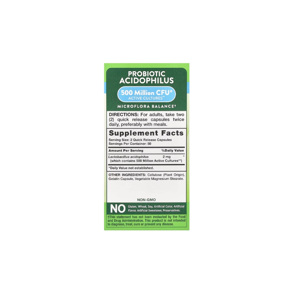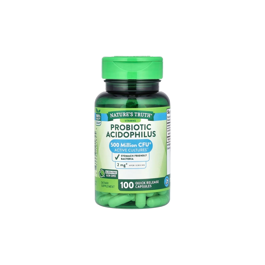 Nature's Truth Daily Probiotic Acidophilus (500 Million CFU) - 100 капсул - ежедневный пробиотический комплекс на основе Lactobacillus acidophilus для поддержки микробиому и комфортного пищеварения. Формула stomach-friendly, не нуждается в холодильнике и изготовлена без глютена и ГМО.