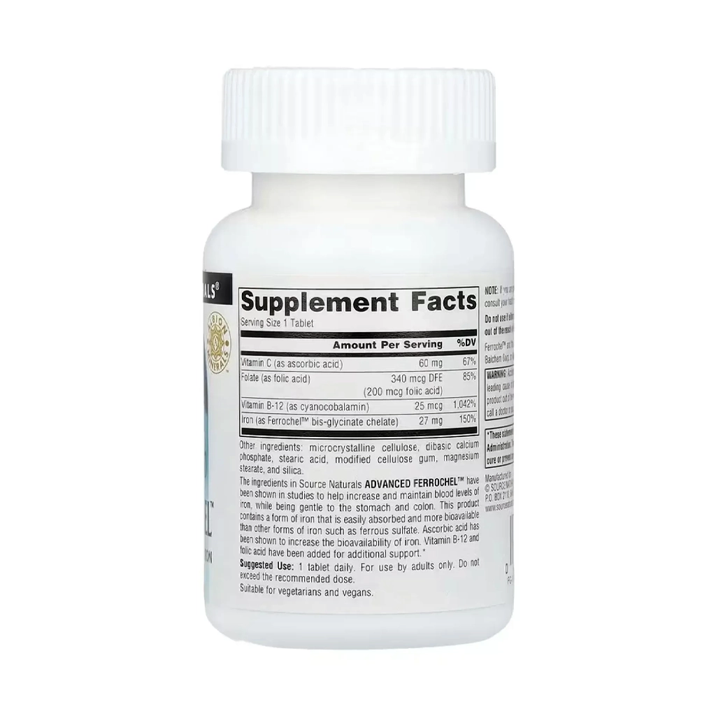 Source Naturals Advanced Ferrochel™ 27 mg — це добавка заліза у запатентованій хелатній формі Ferrochel™ (залізо бісгліцинат) від Albion Minerals — світового лідера у виробництві хелатних мінералів. Ferrochel™ є однією з найбільш досліджених форм заліза, яка за даними клінічних випробувань демонструє значно вищу біодоступність порівняно зі звичайним сульфатом заліза, при цьому залишаючись м’якою для шлунка та кишечника — без характерних побічних ефектів у вигляді нудоти, закрепів чи болю у животі.
