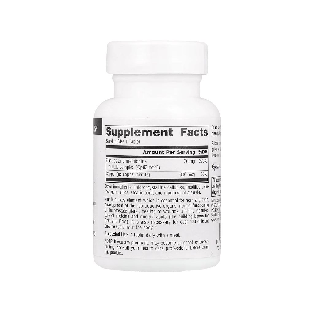 Source Naturals OptiZinc® містить 300 мкг міді (copper sebacate) у кожній таблетці. Це не випадково — це важлива частина формули.